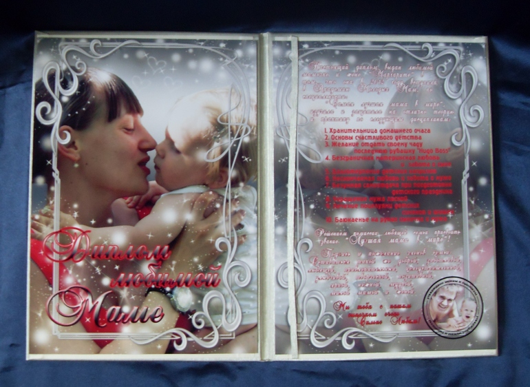 Вот такой необычный поступил заказ от папы годовёнка! Совместно у нас получился подарок маме в виде набора из диплома, ордена и рамки для отпечатка ручки малыша: