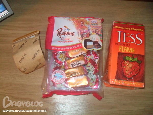 вкусности для всей семьи, чай для папы, кофе для меня ( обожаю кофе) конфетки( вкуснючие), и еще была шоколадка с Машей и Мишей(доча сразу утощила)