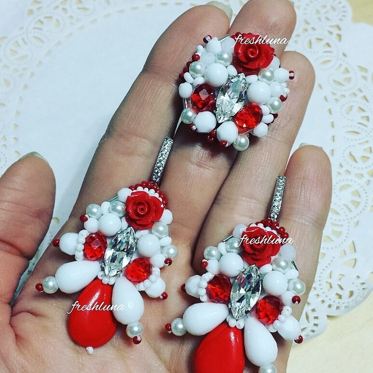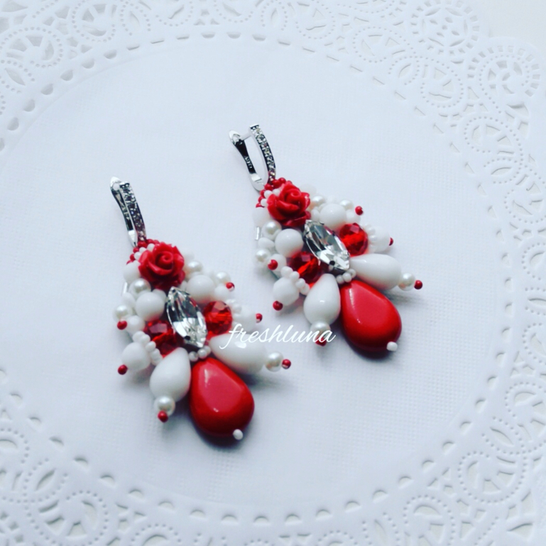 Выполнены из кристаллов Сваровски, коралла, агата, жемчужных бусин, японского бисера, кристаллов.