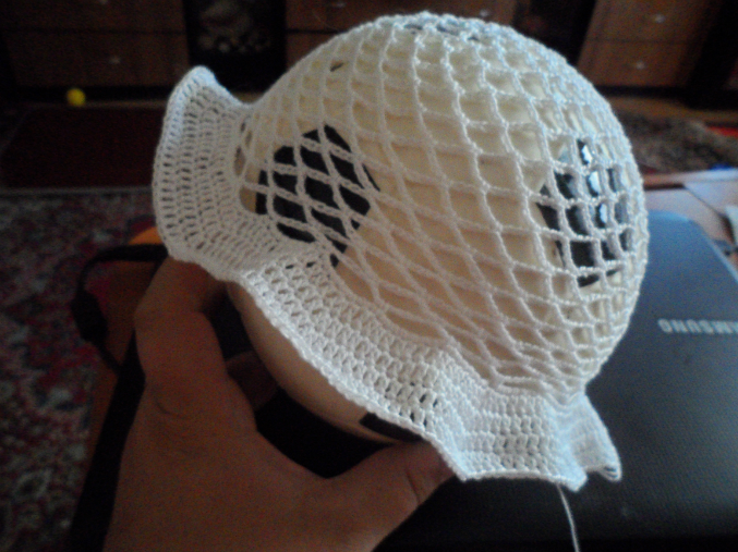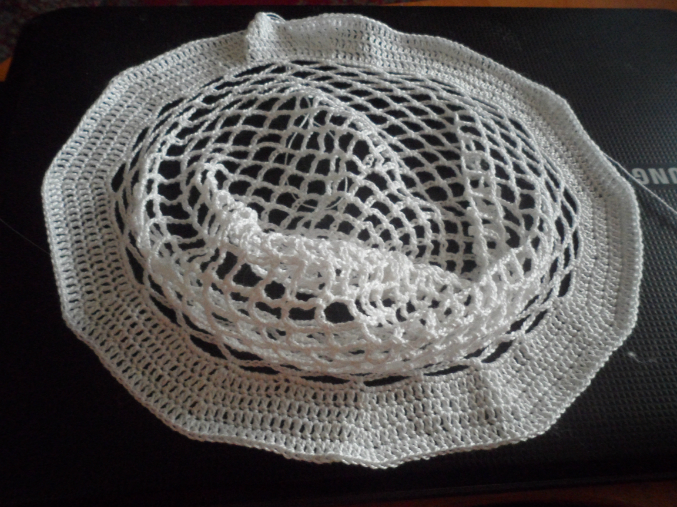 Но возникла неуверенность с полями. Описание: верхняя часть шляпки Вяжется по схеме до нужной глубины, делается обвязка СБН. Поля вяжутся СН, при этом делается по 10-12 прибавок в каждом ряду. В последний ряд вставить регелин (леску)или просто обвязать рачьим шагом.