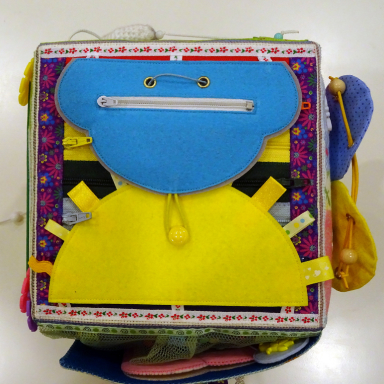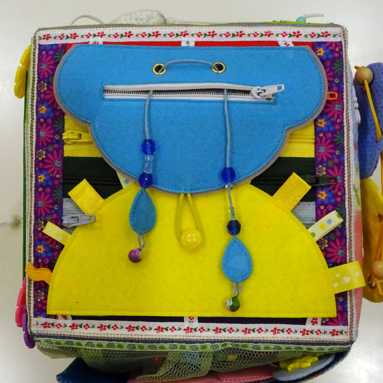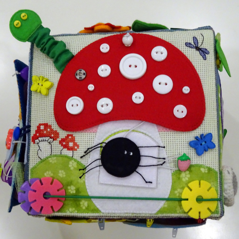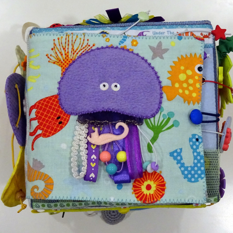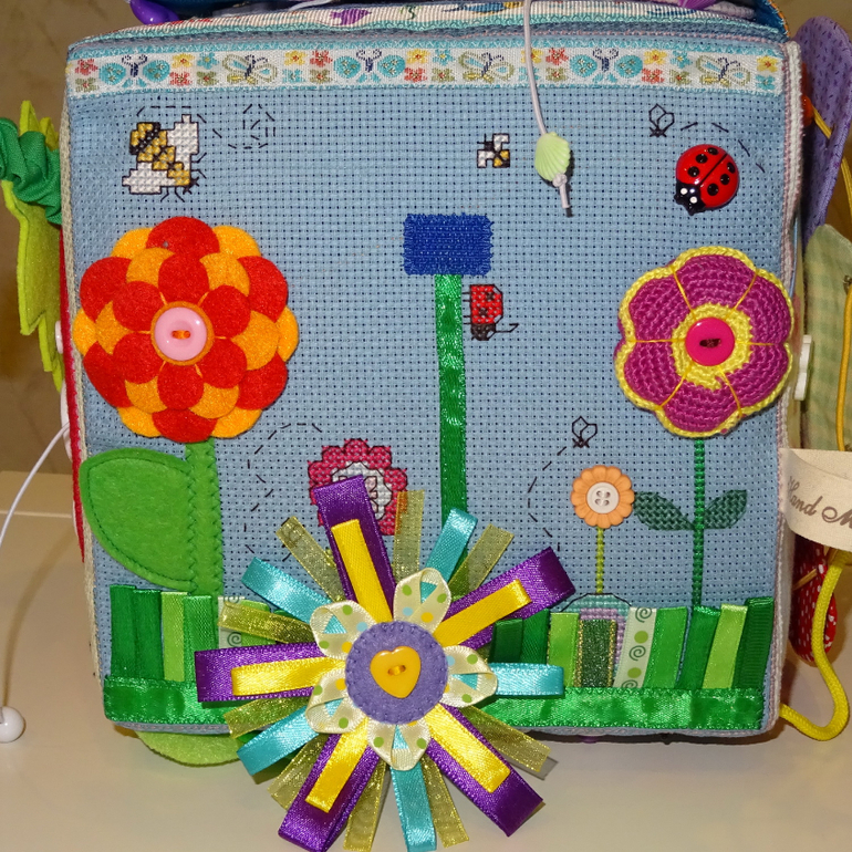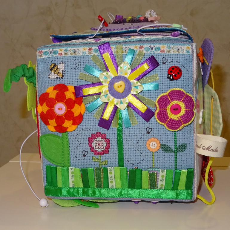 В этом кубике в качестве основы для сторон взята канва, благодаря чему можно было добавить элементы, вышитые крестиком. Сшиты стороны вручную бискорнюшным швом, что дало ровные, чёткие грани и мозоли на пальцах) Ну а вообще, как обычно - много разных фактур, элементов и возможностей для игр. Размер примерно 17 на 17 см.