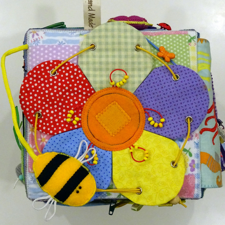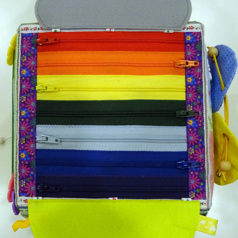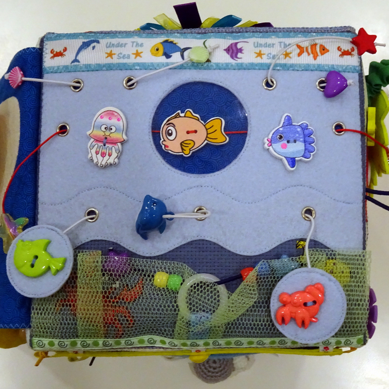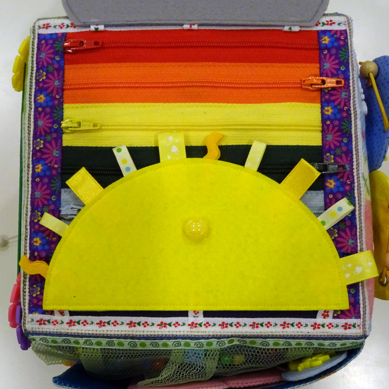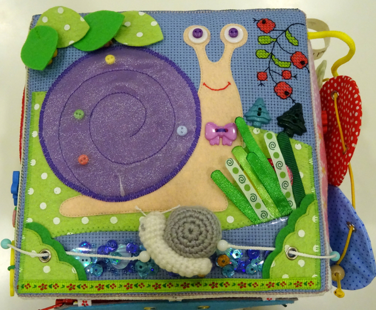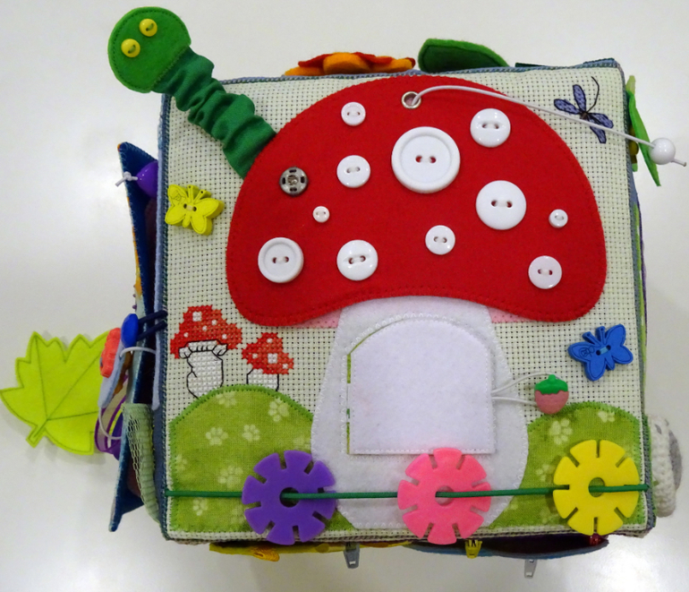 В этом кубике в качестве основы для сторон взята канва, благодаря чему можно было добавить элементы, вышитые крестиком. Сшиты стороны вручную бискорнюшным швом, что дало ровные, чёткие грани и мозоли на пальцах) Ну а вообще, как обычно - много разных фактур, элементов и возможностей для игр. Размер примерно 17 на 17 см.