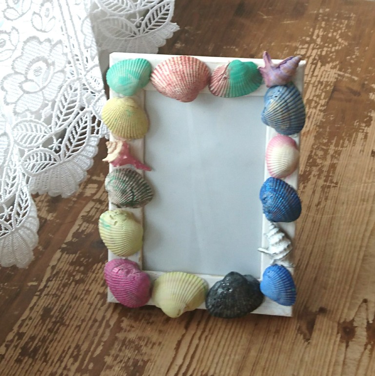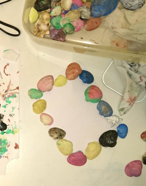 как только высохла покрашенная рамочка (на ночь оставили сохнуть, чтобы наверняка), так приклеили ракушки горячим клеем.