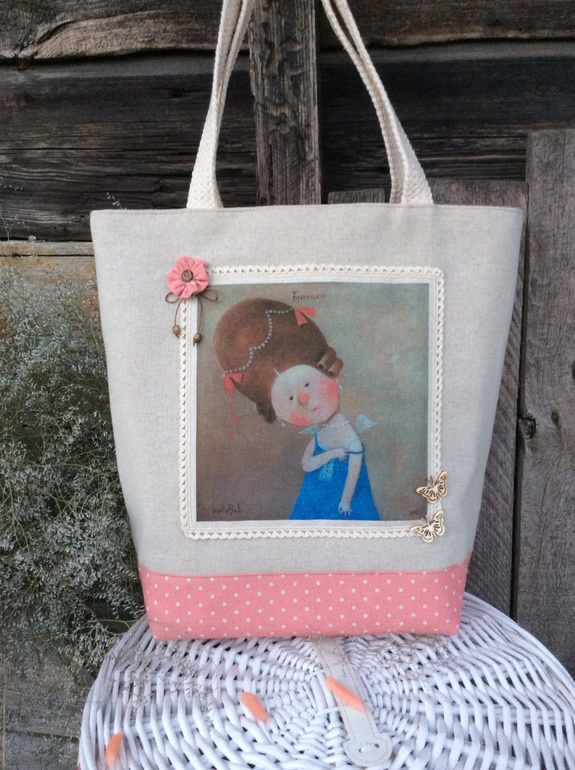 Шитье одежды, выкройки, ремонт одежды, шторы, швейные машины (уже приобретенные)Сумкака тоут "Бретелька" по мотивам картины Е. Гапчинской. Материалы: лён + хлопок, суровый лён, небеленая бязь, магнитные кнопки, деревянная фурнитура.