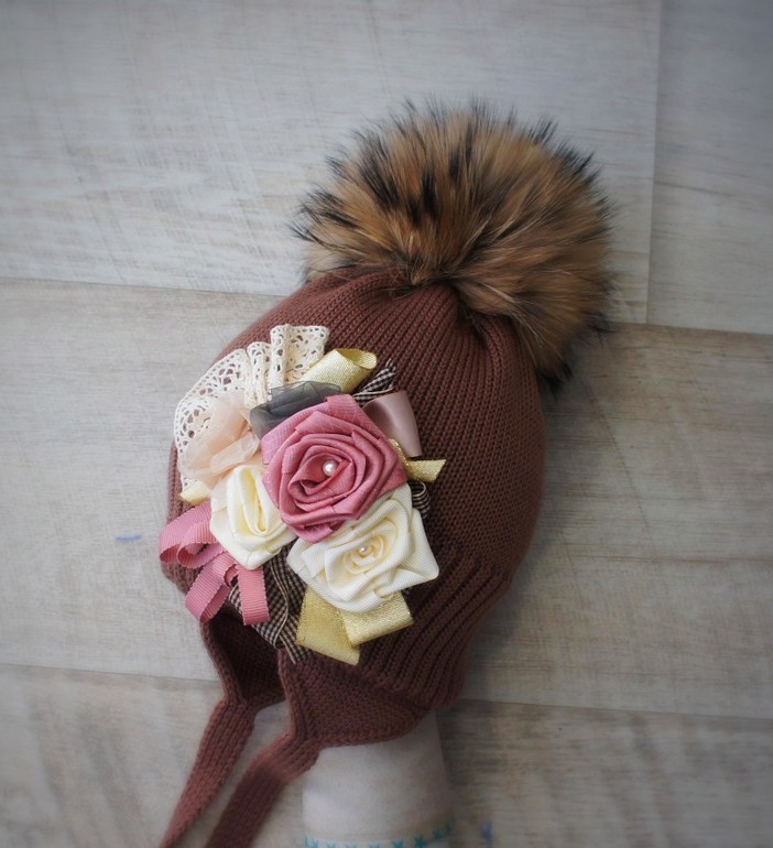 Зимняя шапочка цвета какао, украшена розами и бусинами сваровский .