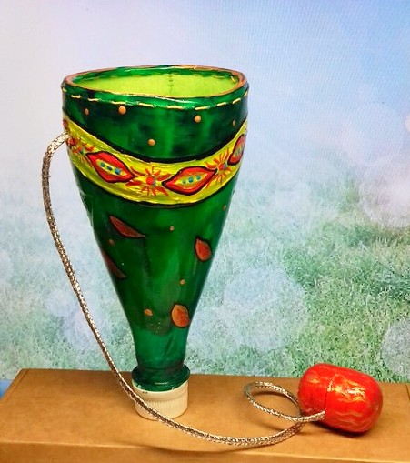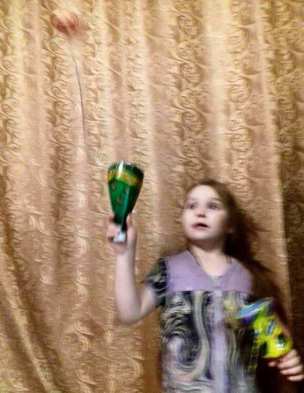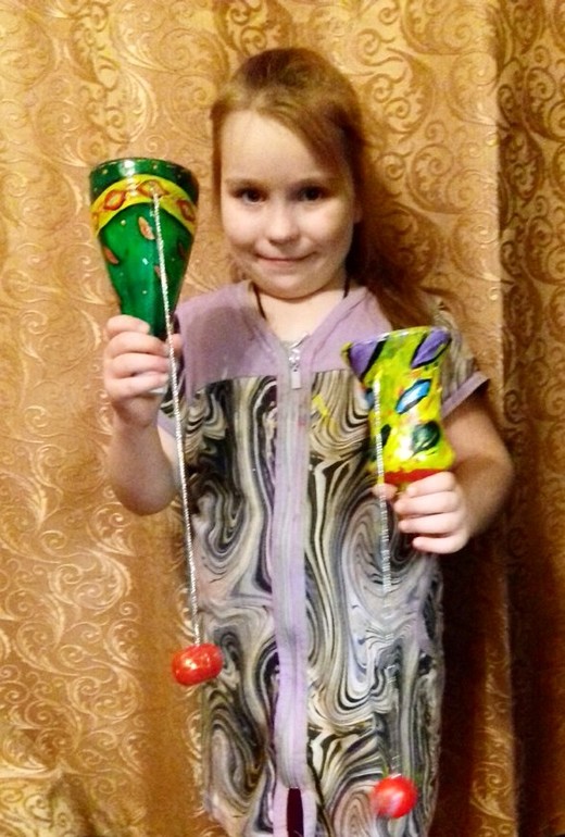 Поделки с детками.Сделали с Лизой из пластиковых бутылок и яиц от киндер-сюрпризов вот такие игрушки-вариации на тему бильбоке. И вот, что получилось.