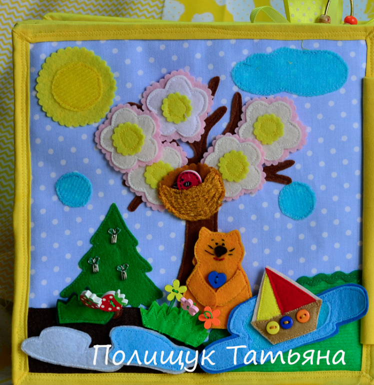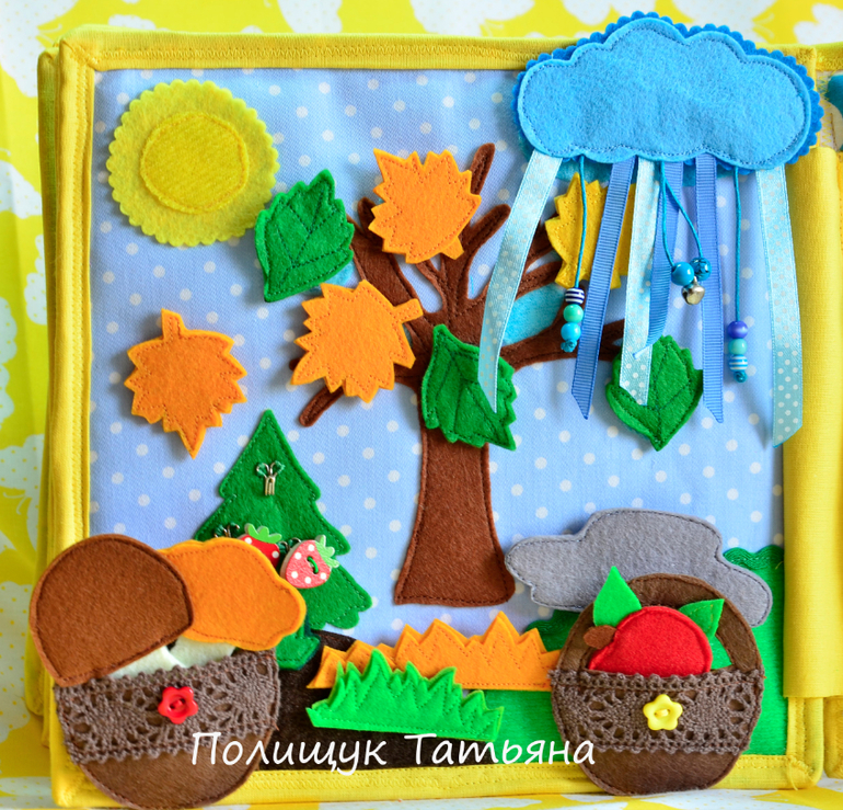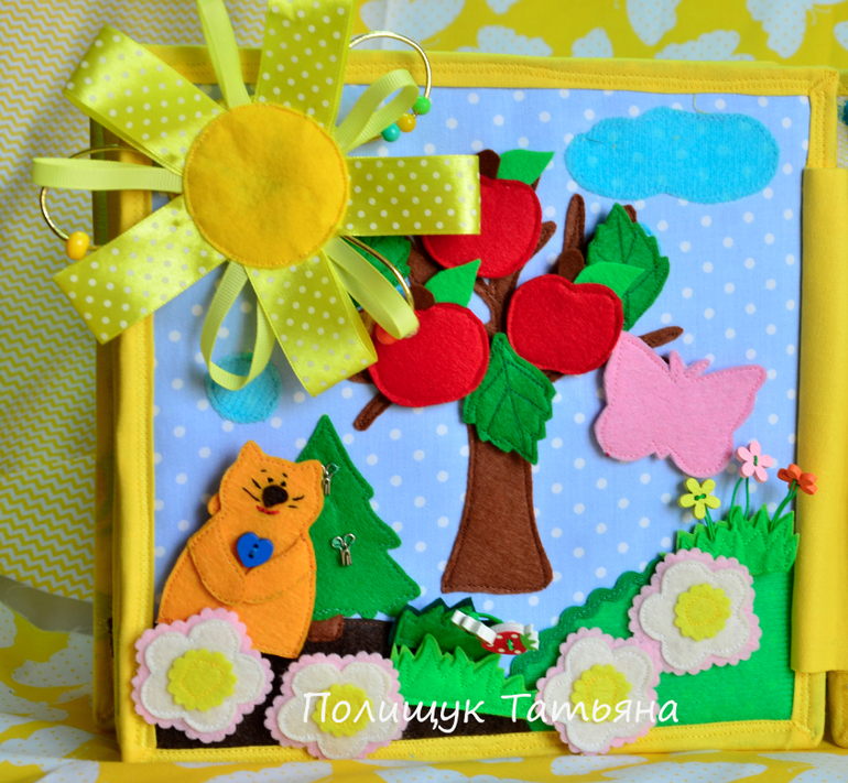 Много фото Книжка развивает мелкую моторику, внимание, сообразительность, логическое мышление, тренирует усидчивость, также на последнем развороте этой книги можно познакомить малыша с временами года(зима, весна, лето, осень) Главным героем этой книги есть рыжий кот, он одевается на пальчик, и можно разыграть разные сценки с его участием