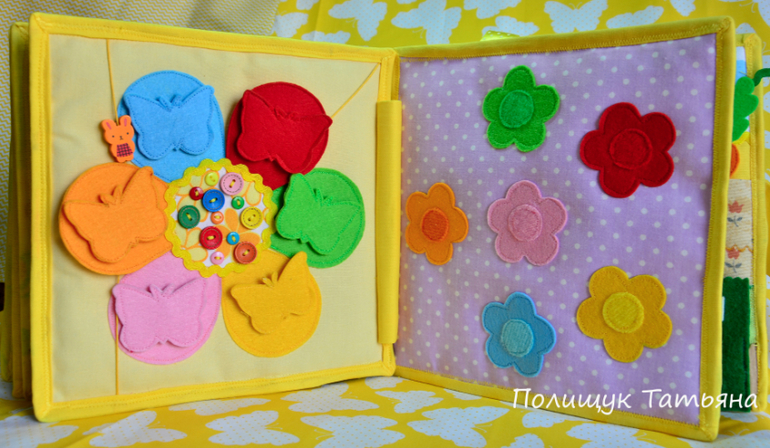 Данный вариант книжки рассчитан для ребенка возрастом от 2лет, с помощью этой книги малыш познакомится с цифрами и счетом до 5, научится различать цвета и подбирать их вместе два одинаковых. Страницы могут быть разными по содержанию. Не обязательно как на фото. Все обсуждается индивидуально