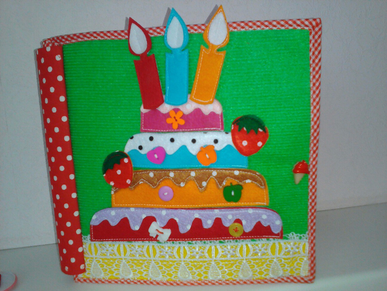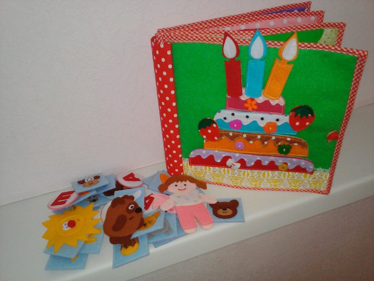 Развивающие игрушкиХочу представить вашему вниманию новую книжечку. Обложка пирамидка тортик. Буквы и составляющие торта крепятся на липучках на велкро ткань.