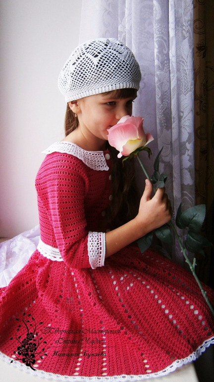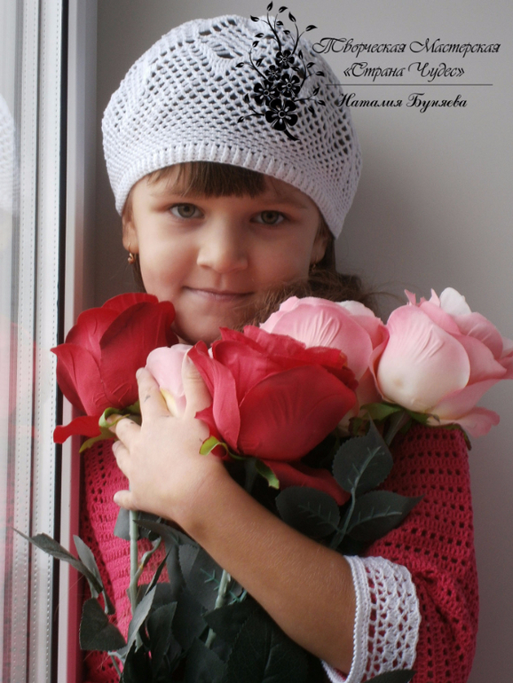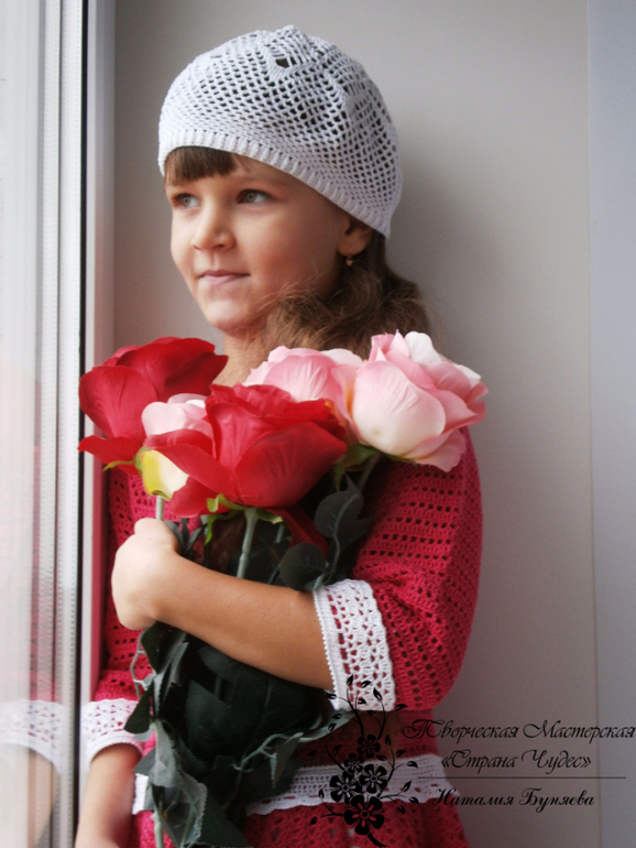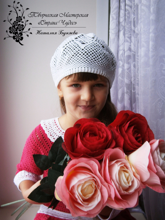 Очень красиво. И дочка красавица!!!! И за идейку спасибо!!! Мне видится Ваше платье как школьная форма: чёрное или темно синее с белыми воротничком и манжетами, с букетом цветом, с огромными белыми бантами))))) ну первоклашка!!!!!!!