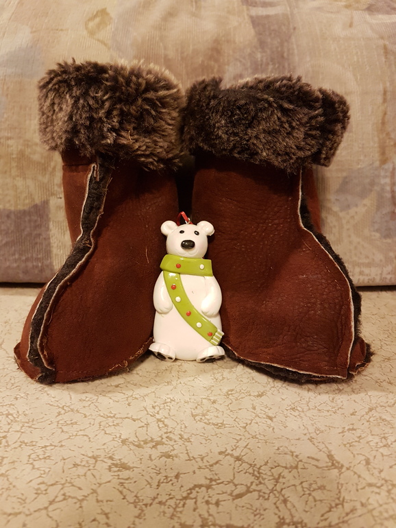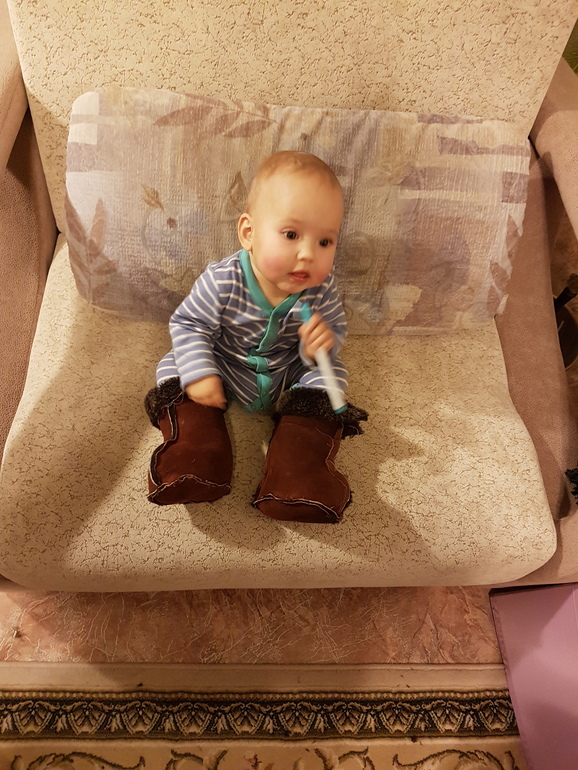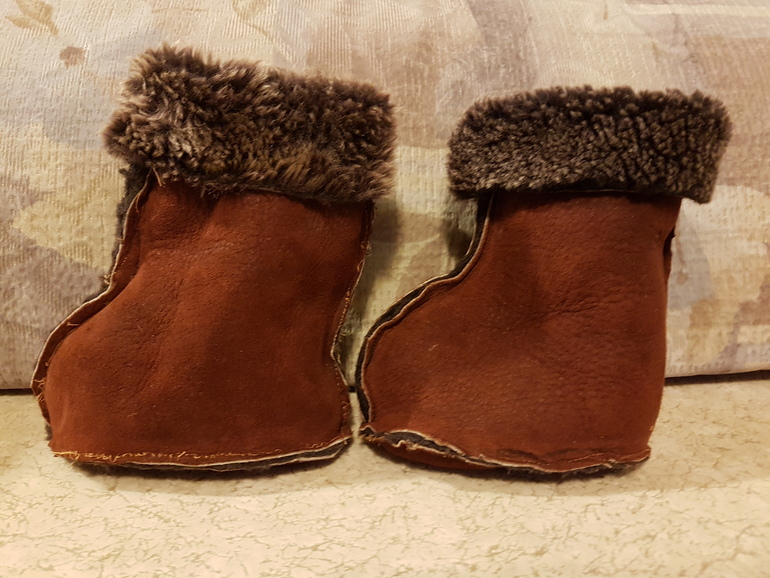 Так интересно совпало, что тут же параллельно почитывая дневники других мамочек на ББ, наткнулась на такую фотографию) Конечно, работа более ювелирная и оттого эстетичная, деталей больше, схема сложнее, но смысл тот же - тёплые ножки в овчине)