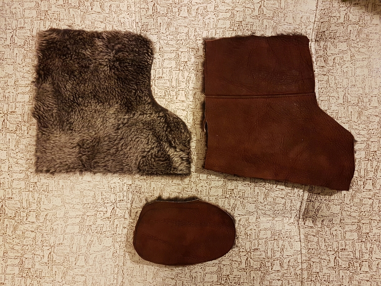 И вот мы отрезали от неё капюшон, рукава, карманы, отпороли пуговицы. Из рукавов раскроили угги. Кроили от руки. Вот три детальки на один валенок:
