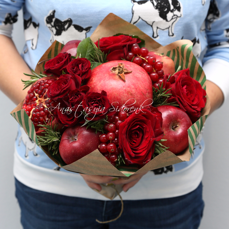 Состав: гранаты, яблоки, смородина (по сезону клубника), розмарин, цветы по сезону.