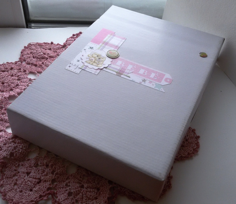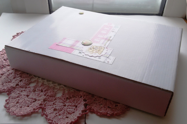 к альбому сделалась еще простецкая коробочка из гофрокартона (для пересылки по почте, чтобы альбом не повредился, а то у нас на почте вечно нет подходящей упаковки, а сейчас ближе к новому году вообще наверное не будет никакой, как в прошлые года...), сверху приклеила остатки от набора бумаги :) чтобы веселее было получать посылочку :)
