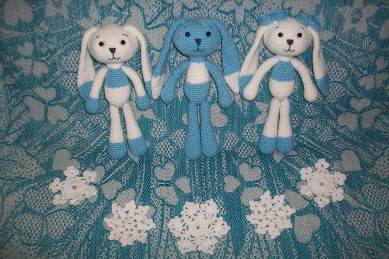 Амигуруми (вязаные игрушки)В преддверии зимы и в ожидании снега (а то этот гололёд уже совсем достал!) связались у меня вот такие зимние зайки. Снежинки вязались еще прошлой зимой, просто очень хорошо дополнили общую картину:)