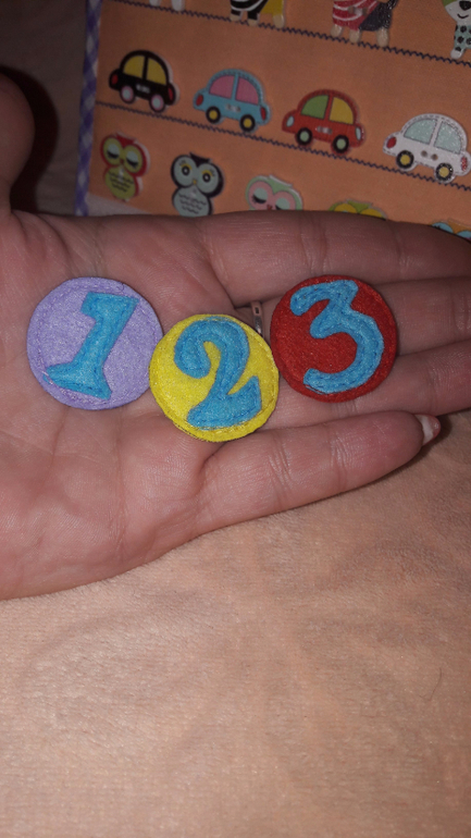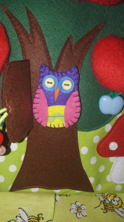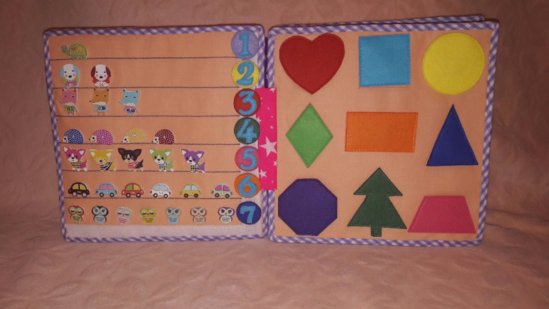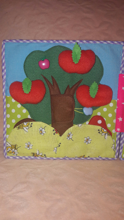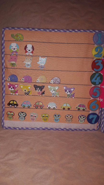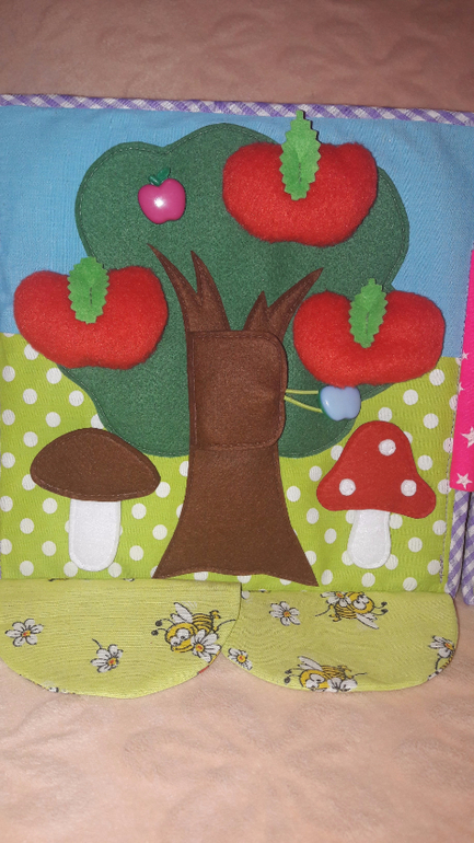 основа странички велькроткань, убрав пазлы, можно поиграть с другими детальками, например налепить яблочки и грибочки и подобрать к ним нужную по количеству цифру ..