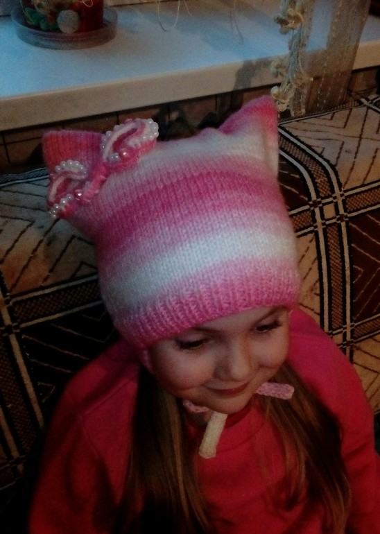 Вот такая шапочка навязалась для старшей дочки. Нужно было связать быстро и без хитрого рисунка. Кошачьи ушки - пожелание дочки. Шапка на флисовой подкладке. Дочь довольна.