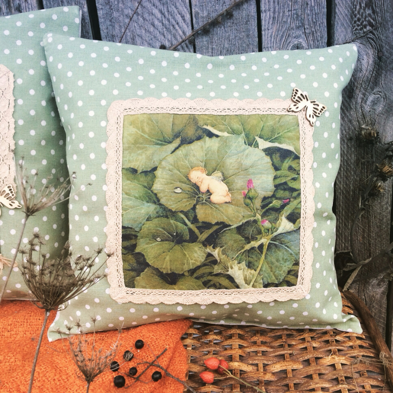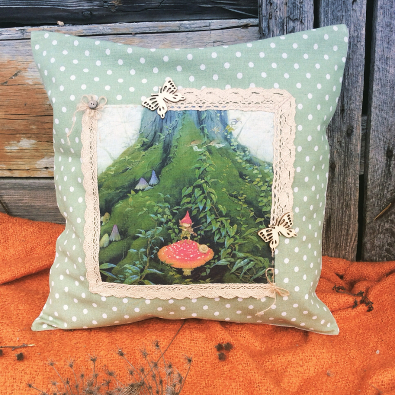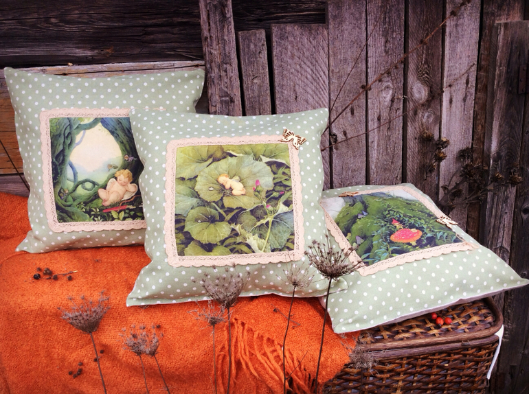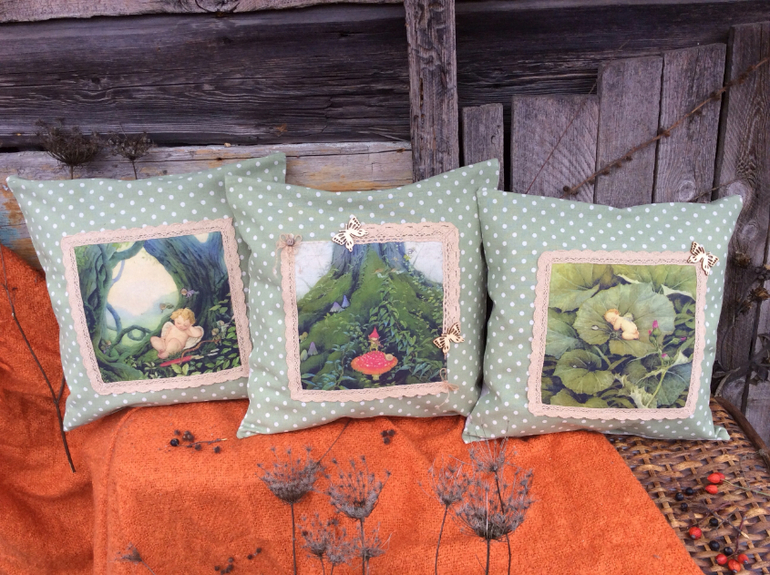 Шитье одежды, выкройки, ремонт одежды, шторы, швейные машины (уже приобретенные)Комплект "Волшебный мир". Чудесные эльфы, гномики и ангелочки. Как всегда использовала натуральные материалы: хлопок-лён, лён, хб кружево, деревянные пуговки и бабочки. Каждая подушечка состоит из основной, сшитой из бязи и наполненной синтепухом и наволочки. Размер 38 x 38