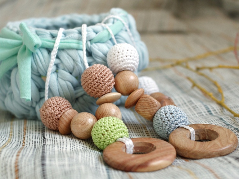 Подарки, игрушки, погремушки для новорожденных.Связала вот такие кулончики на шею, чтоб ручки малыша занять чем то более полезным и ярким, чем мамин нос 😂