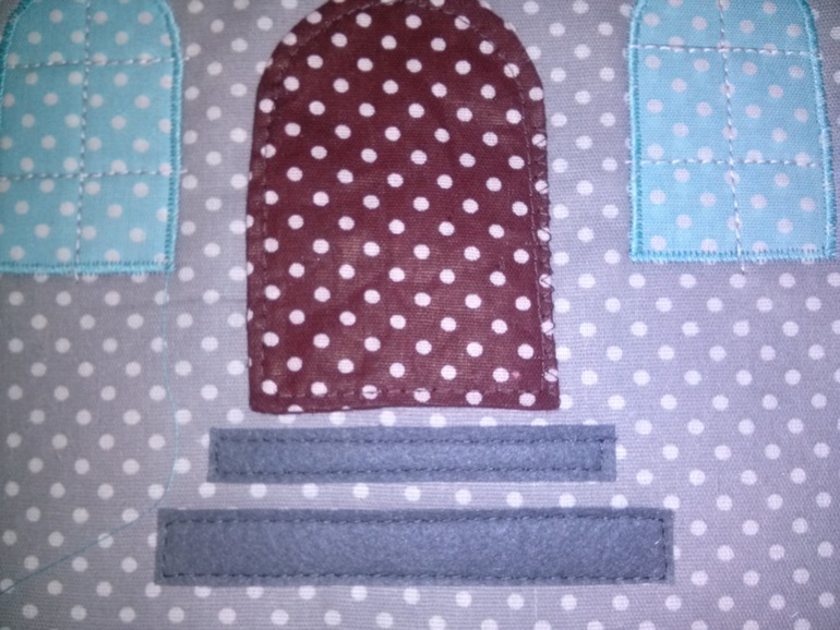 Пришиваем окошки. На окошке делаем разметку для рамы. Примеряем место расположения, прикалываем булавочкой (если нужно), двойной ниткой прошиваем прямой строчкой.