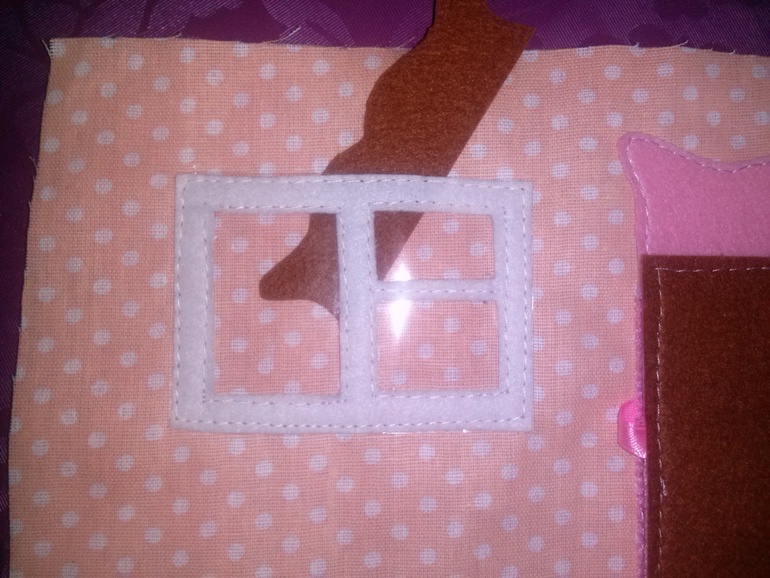Окно. Вырезаем раму и прозрачную пленку (я взяла с коробки из под игрушки). Прикладываем детальки, прострачиваем по внутреннему контуру, и сверху, как показано на рисунке. Пленку лучше взять побольше, детали скользят, обрезать после того, как прошьете.