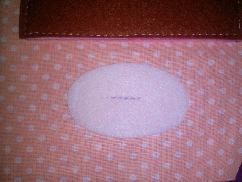 С изнаночной стороны детали я проложила уплотнитель (техничесткая салфетка). Уплотнитель у меня по размеру детали, это было ошибкой, Уплотнитель должен быть на 1,5 см. меньше детали, что при сборке не попадал в шов, иначе получается очень толсто,