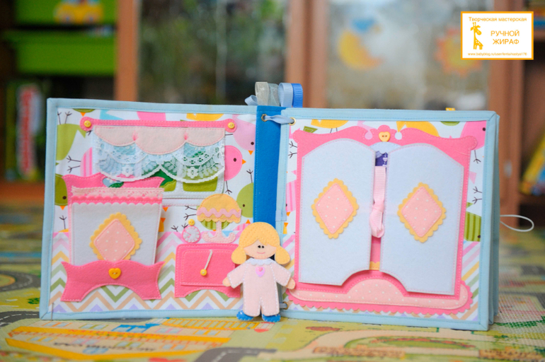 Из фетра: задняя стенка стенка шкафа - 1 дет., дверца шкафа - 2 дет., кровать - 1 дет., спинка кровати - 2 дет., окно - 1 дет., коврик - 2 дет.