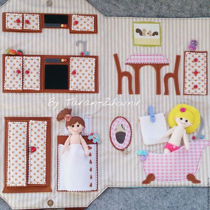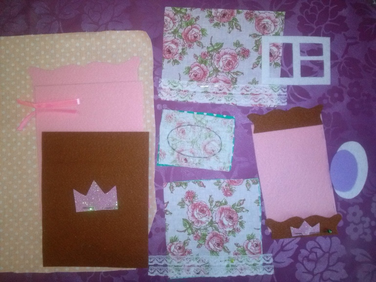 Сначала все детали вырезаем из бумаги и примеряем к комнате и куколке. Потом делаем выкройки из фетра и хлопка.