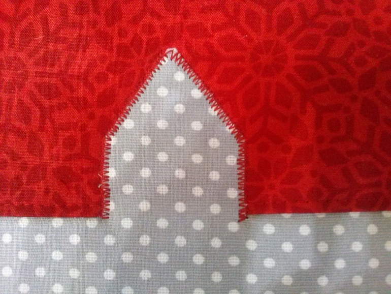 Шьем фасад. Пришиваем крышу к фасаду, место чердачного окна пропускаем, шов показан красной линией, затем обрабатываем швом зиг-заг.
