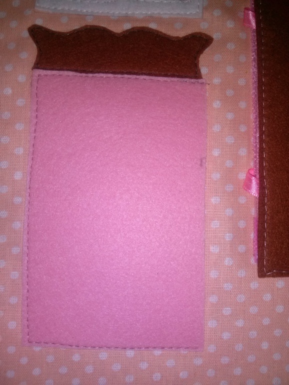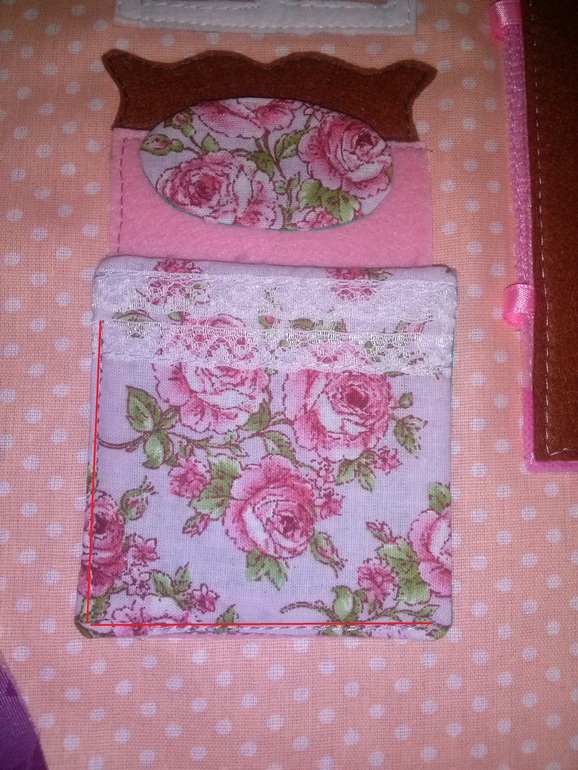 Далее шьем дверь. У меня деталь со сгибом. будет застегиваться на липучку. Пришиваб липучку, прошиваем деталь по периметру, оставляя отверстие для выворачивания. Деталь выворачиваем, утюжим, зашиваем отверстие, через которое вывернули деталь. Прострачиваем по периметру. Пришиваем декор на дверь, если требуется (я пришила декор позже, так как забыла про него). Намечаем на фасаде место для второй липучки, пришиваем. Прикладываем дверь к фасаду и прошиваем с одной стороны, липучкой лицом к фасаду. Я пришила строчкой зиг-заг с правой стороны. Показано красной линией.