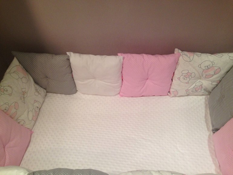 Скажите, а подушки между собой соединены и как крепятся к бортикам кроватки?