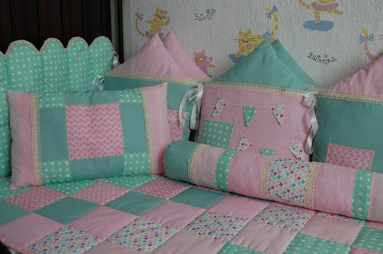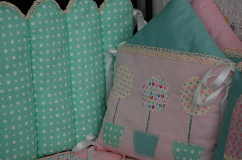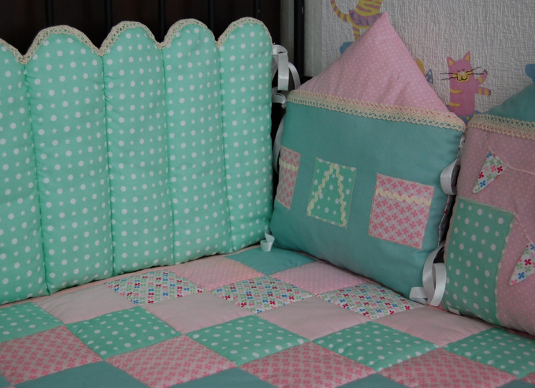 В набор входит 8 подушек домиков,с аппликациями,аппликации не повторяются,два заборчика на короткую сторону кроватки.Лоскутный плед,и две подушки,подушка валик.