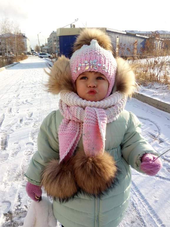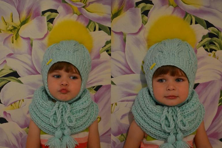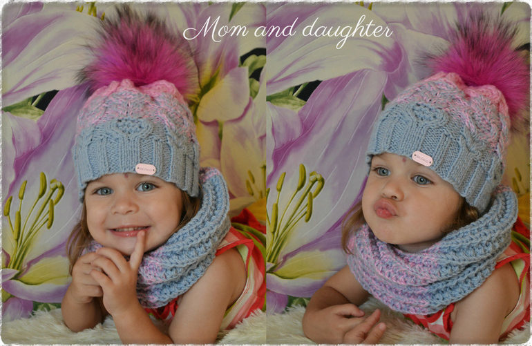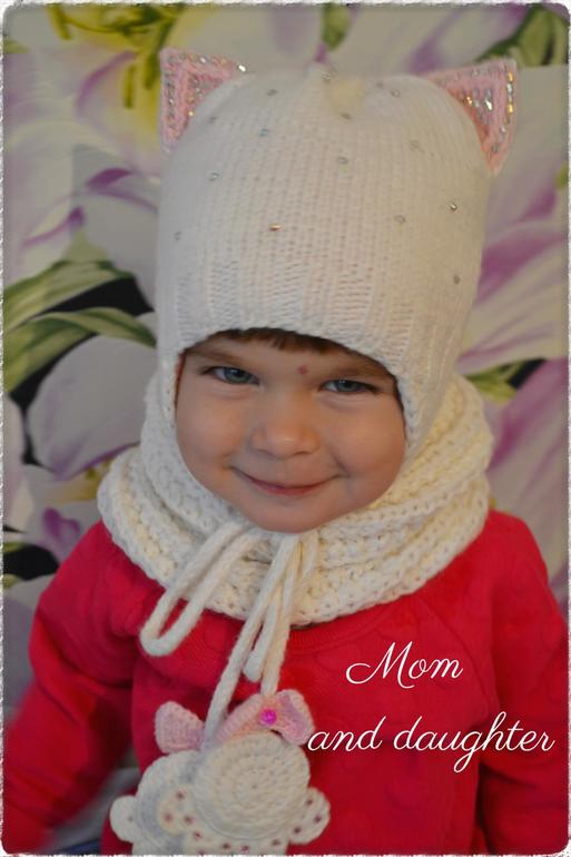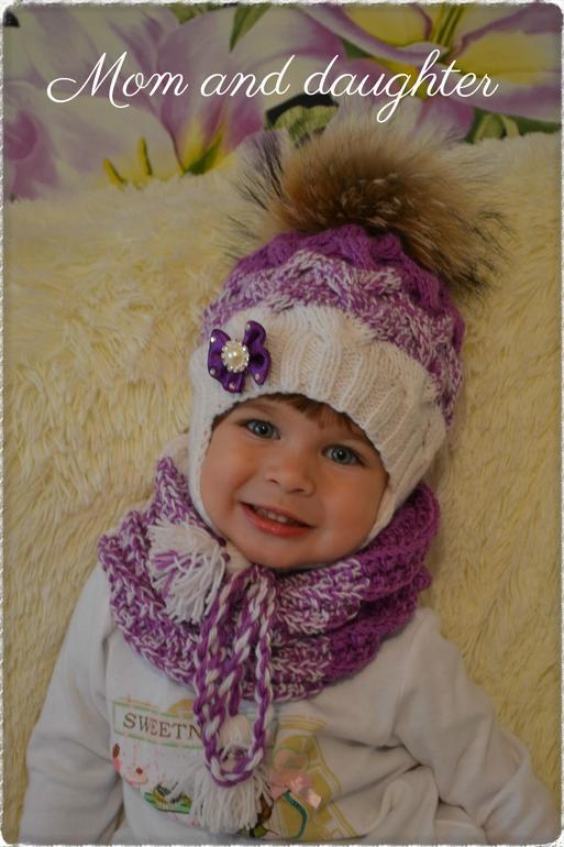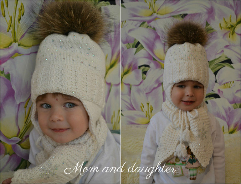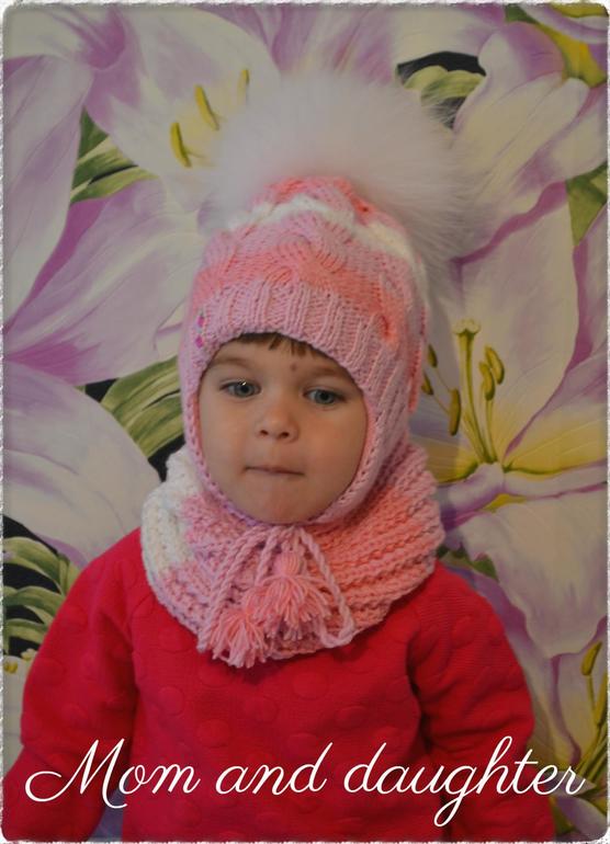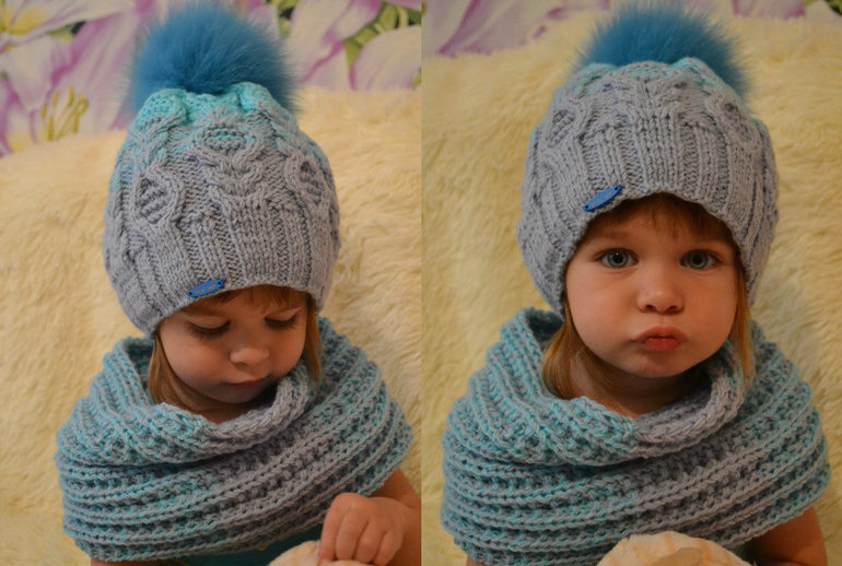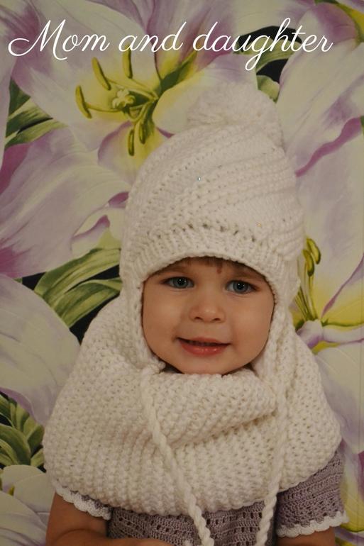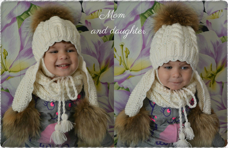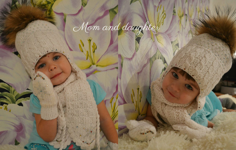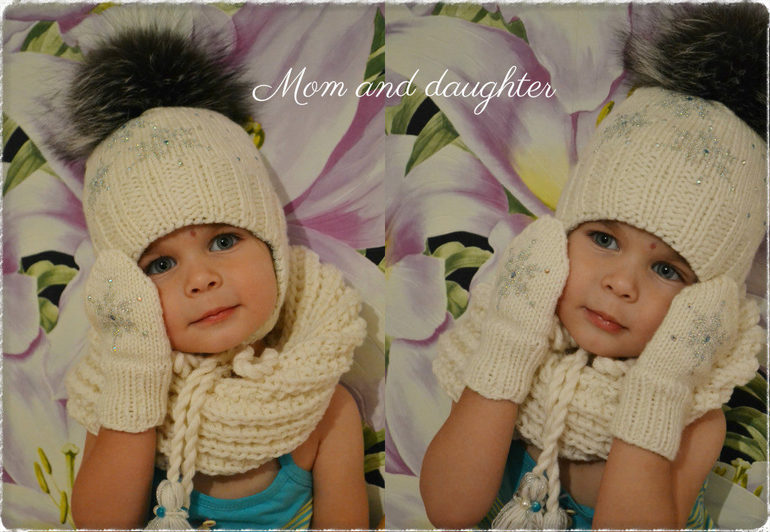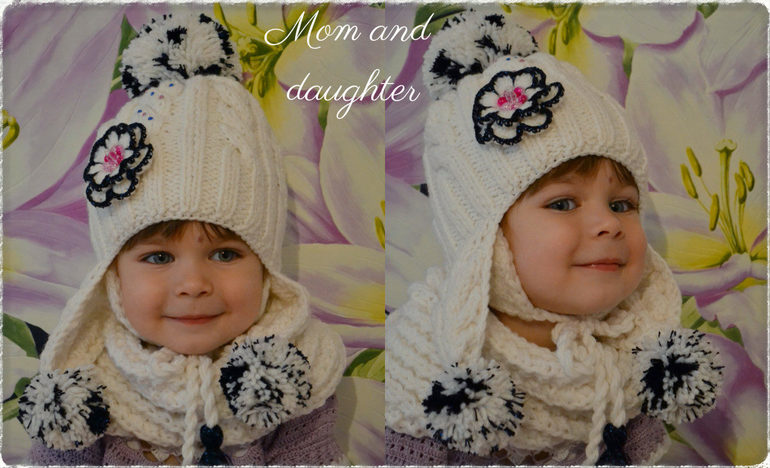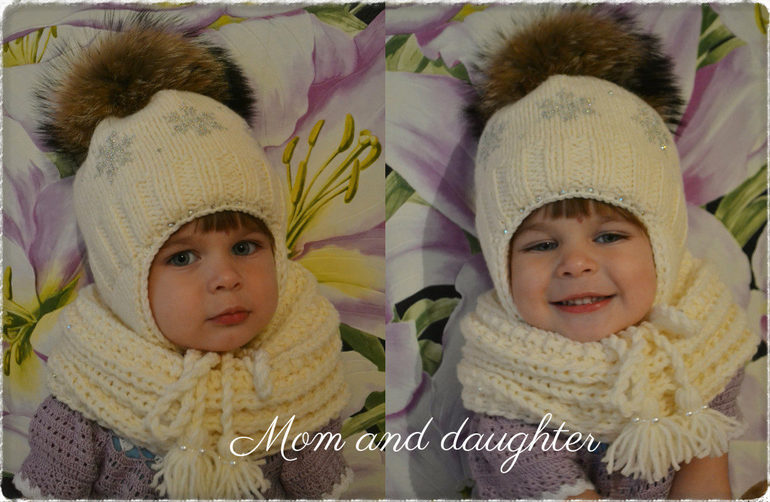 Браво! Дочка модель). Заинтересовала шапочка белая на фоне природы, что за узор? И если можно поделитесь описанием снуда на первых фото.)