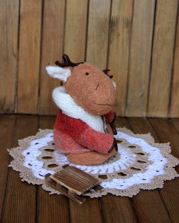На Павле теплая шерстяная кофта и белоснежный шарф, с собой саночки. 13 см. сидя, тяжеленький, опилочный лосяш.