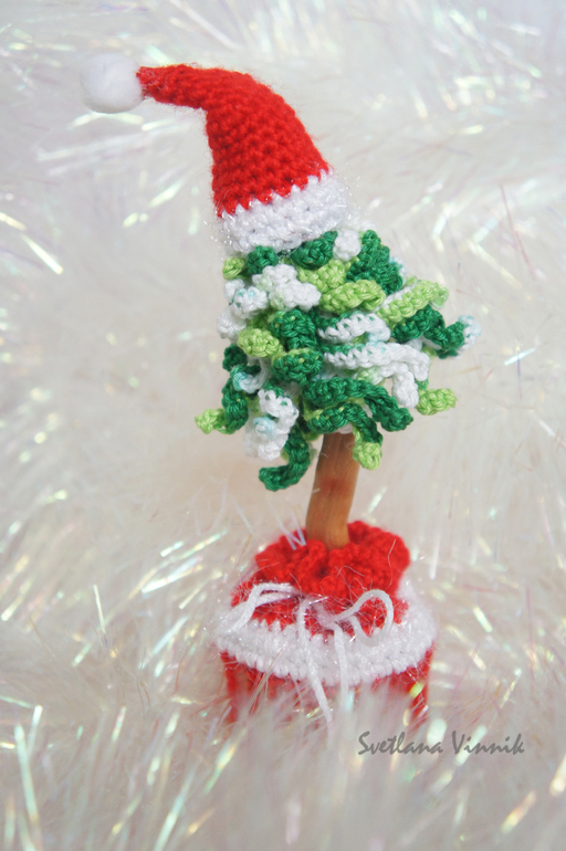 Спасибо. А схемки нет. Вязала на глаз. Внутри для устойчивости крышка обрезанная из под лака пенки для волос, ствол вставила в раствор гипса. Связала донышко с прибавками, затем до нужной высоты без прибавок. Ряд для шнурка. Обвязку любую. Шапочка тоже на глазок. А сама ёлочка: набрать вп см 20, можно больше, а можно меньше. Смотря какой высоты ствол. Связать ряд стбн до конца ряда. 2 ряд - 5 стбн, затем 5вп, 4 стбн по набранным, 1 стбн) - посторить 10 раз. Затем через каждые 10 веточек добавлять по одной вп. Ой, не знаю, понятно ли написала