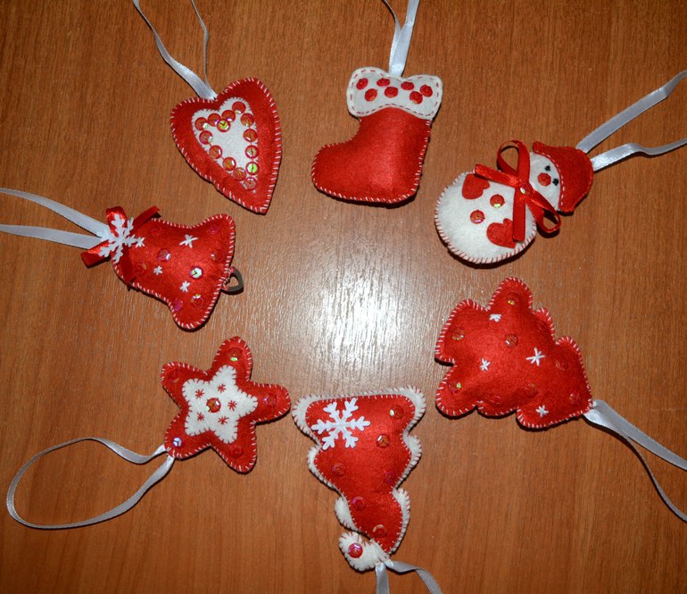 Я все детали сшиваю)фетр тоже 1 мм. Нитки обычные,шью обычно в две нитки,мелкие детали иногда пришиваю в одну нитку)вот шила новогодние игрушки)