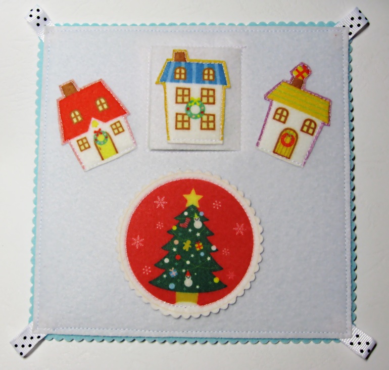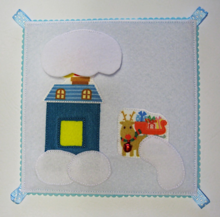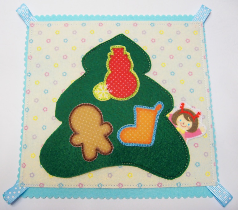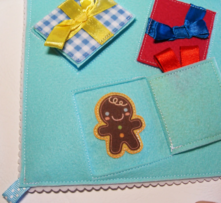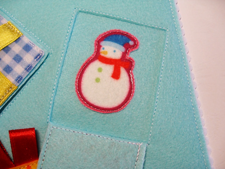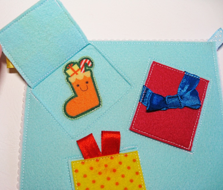 Книжка на кольцах, которые легко снимаются. Можно играть с отдельными листами, а можно повесить, как гирлянду для украшения дома или даже повесить на бортики кровати малышу. Картинка с оленем сверху не прошита, сделана в виде кармашка, туда можно положить небольшой сюрприз.