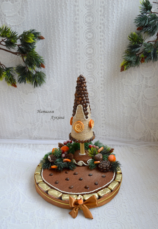 Елочка ручной работы из кофейных зерен, конфеты Птичье молоко.