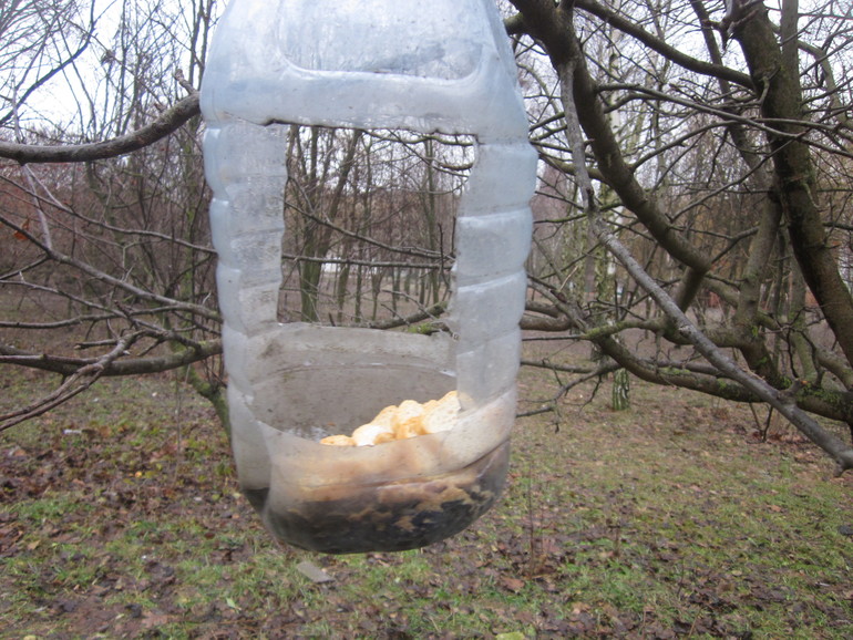 В прошлом году мы повесили кормушку, но эту ветку летом спилили, поэтому мы пошли в кормушке, которая висит недалеко от нашей площадки уже несколько лет. Насыпали семечек и сухариков