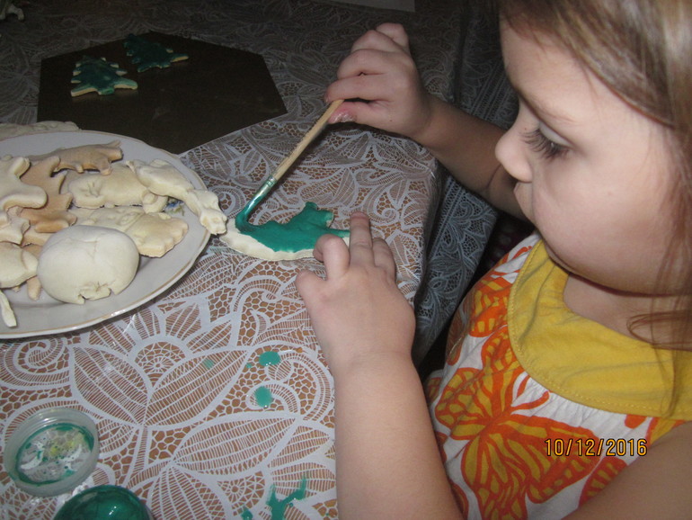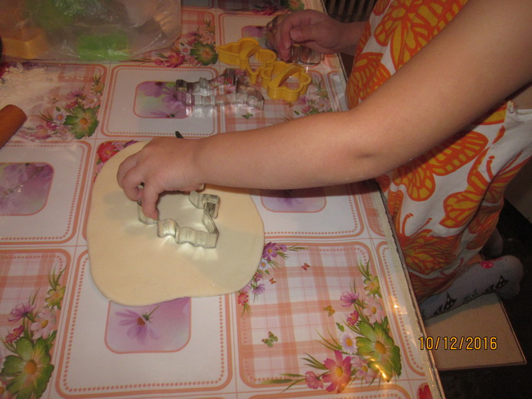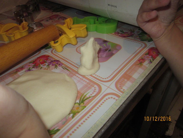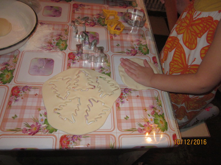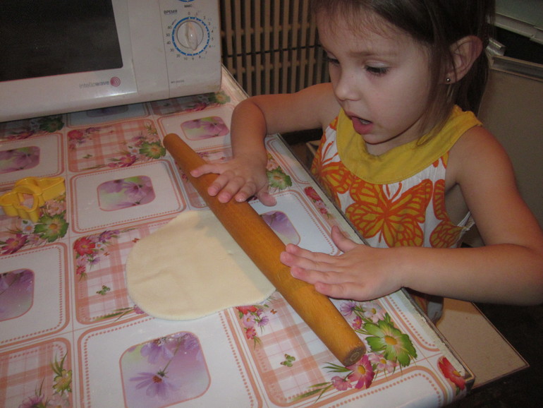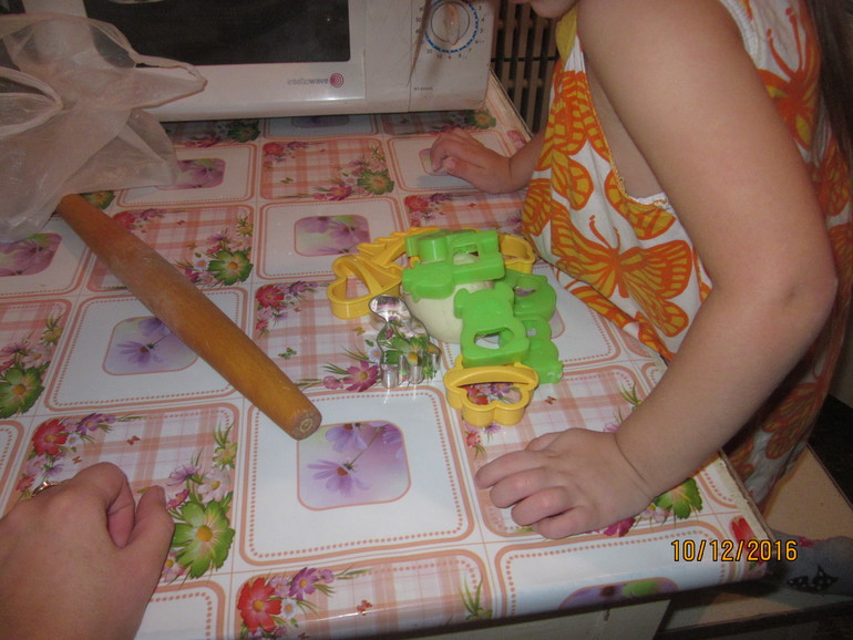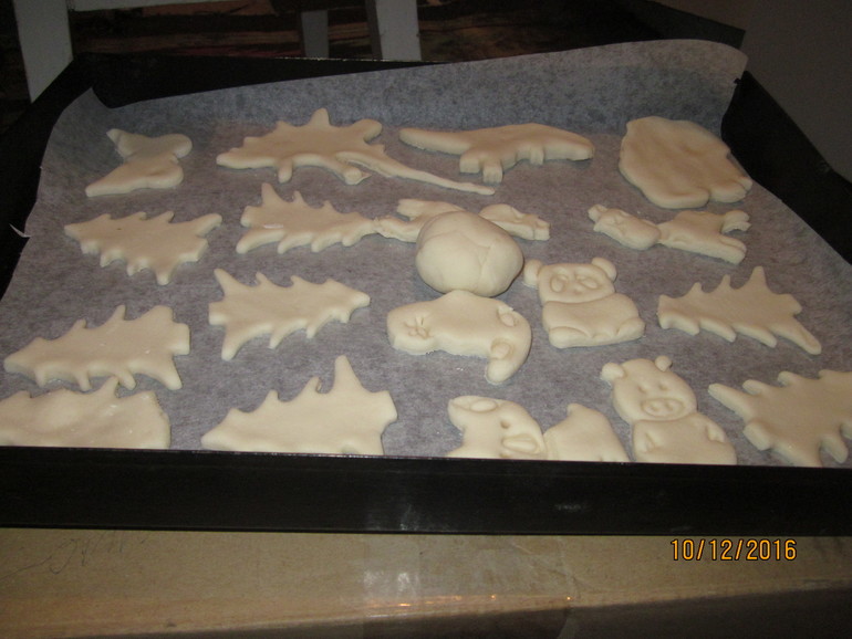 Когда навырезали целый противень фигурок, я занялась обедом, а дочка еще более получала играла с тестом