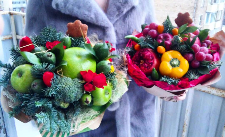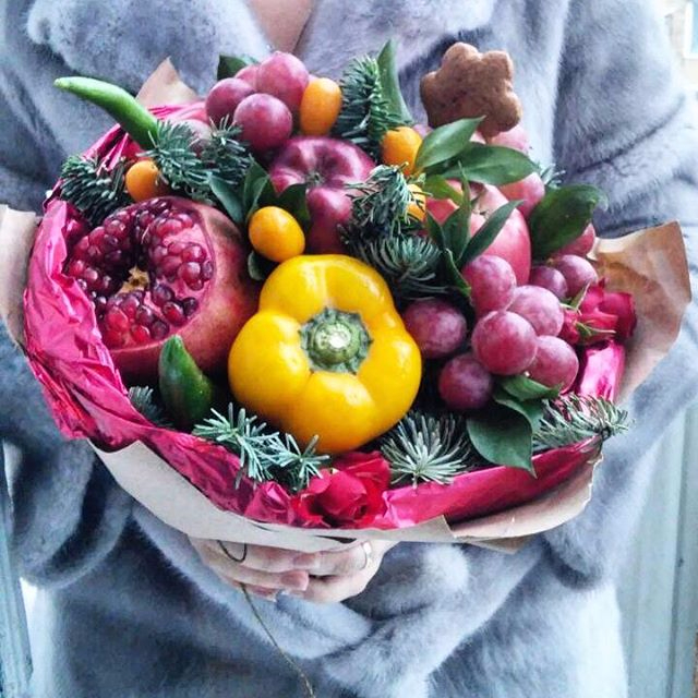 А мне очень, очень нравится. Ваши работы с таким вкусом сделаны. Если бы мне такой подарили, была бы приятно удивлена. Мы же букеты из цветов не едим. Ну и не кушайте то что очищенно. А может просто для красоты и аромата постоит. Я бы прям на праздничный стол поставила. Чудо!