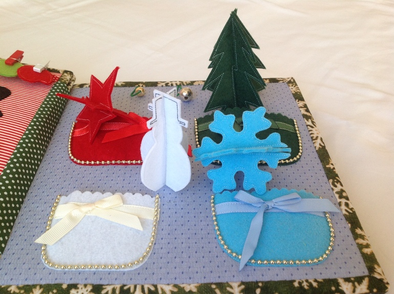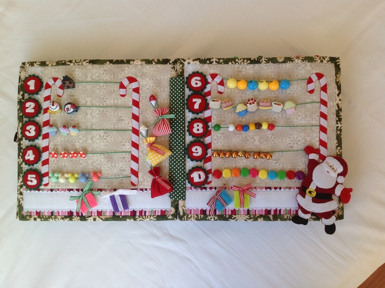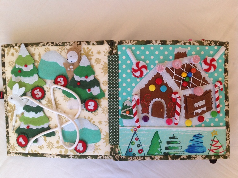 Страничка сладостей. Пряничный домик, на крыше бусины вдеты на прочную нить- можно передвигать. Сладости на магнитике, липучке, вдеваются в колечки. Ёлочка -маленький пазл