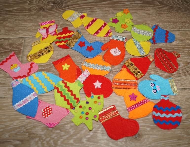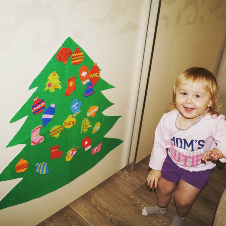 Конечно,лучше бы было если елка была бы из цельного полотна,или швы поменьше бы сделала,но как есть.Первый пробный опыт. Елку и игрушки клеила на плотную клеевую как для ламбрикенов.Игрушки на липучках. Дочка любит их менять местами,находить все варежки или сапожки.