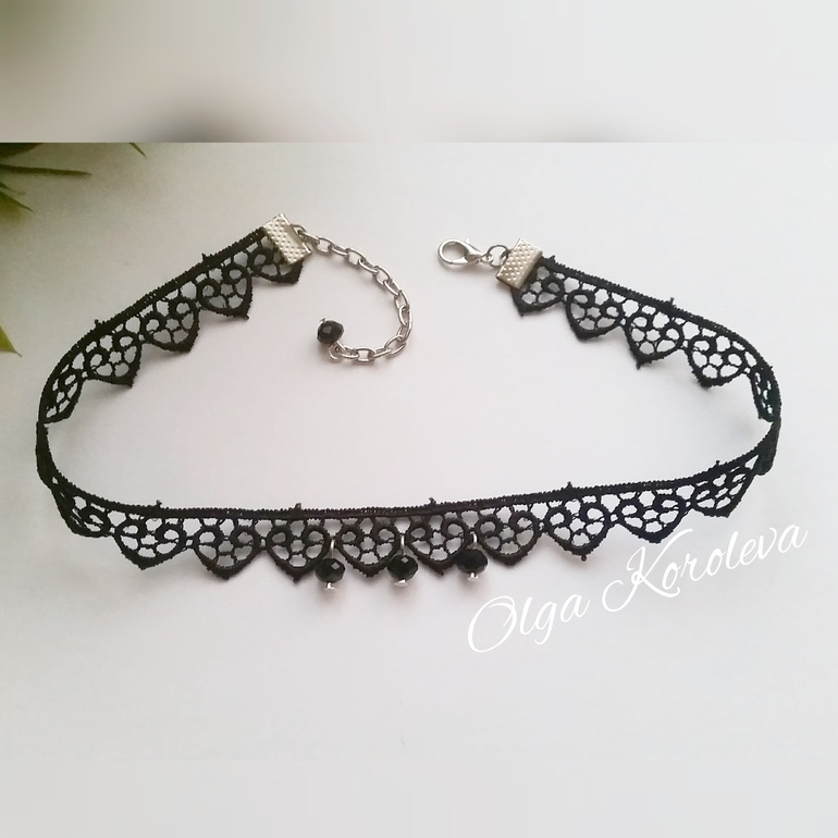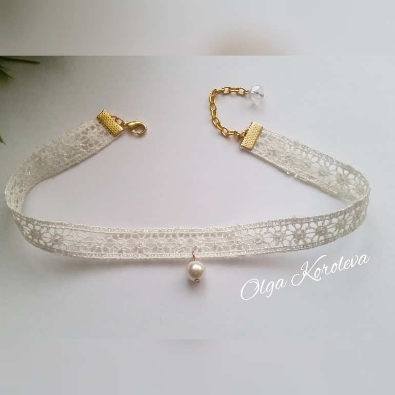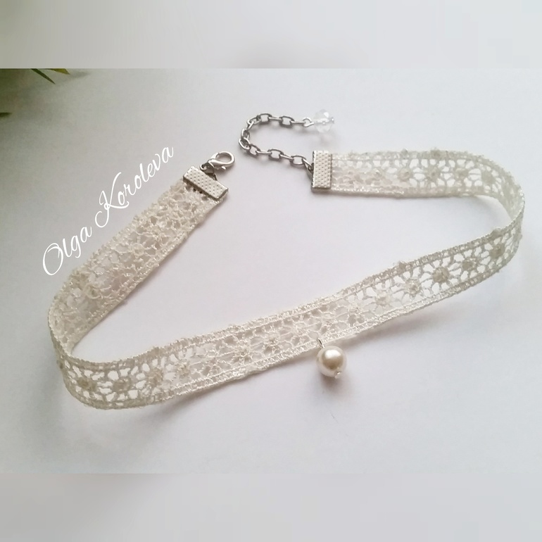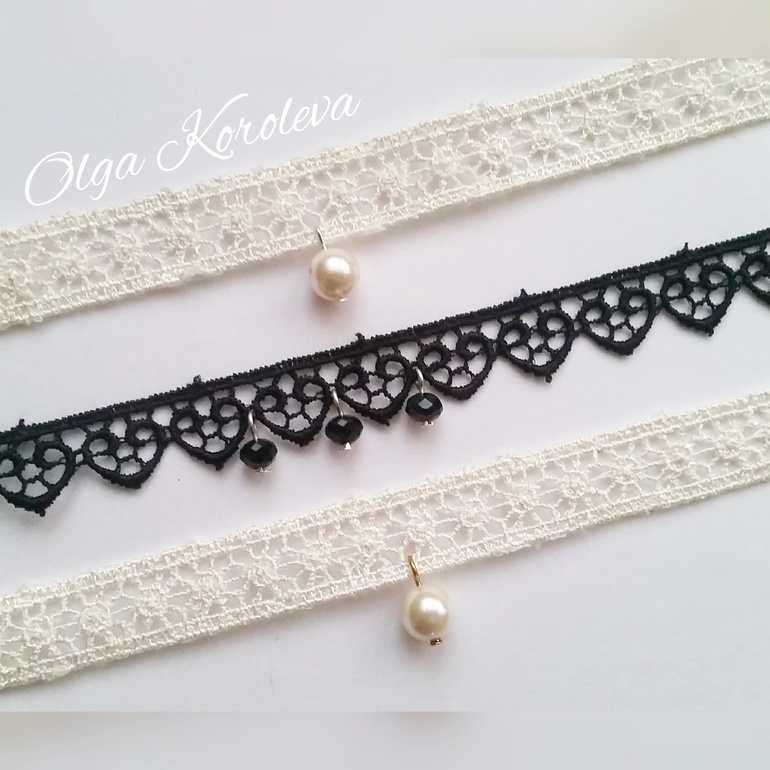 Сделала на днях нежные ажурные чокеры из гипюрного кружева с подвеской-жемчужиной и чешским стеклом.