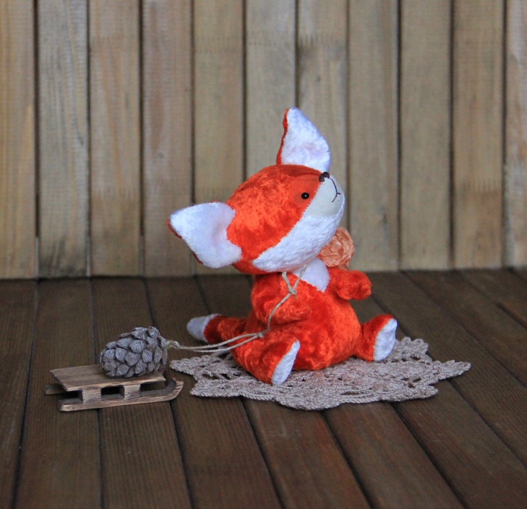 Лисяша застенчивый и добрый, помещается в женскую ладошку. Ростиком невелик, 11 см. сидя, не считая ушек.