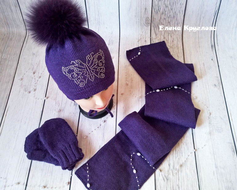 Комплект связан из полушерстяной пряжи и состоит из шапочки на флисе, шарфика и двойных варежек. Под кат 3 фото