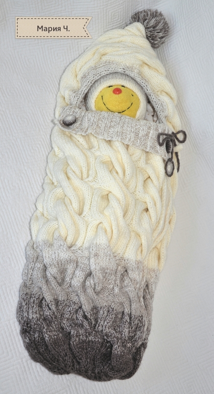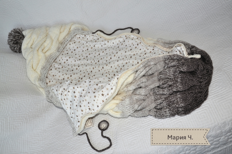 Конверт-кокон, на трикотажном подкладе, замок молния, капюшон вокруг личика затягивается на шнурок, отворот отстегивается (можно прикрыть малыша им, например, от ветра).