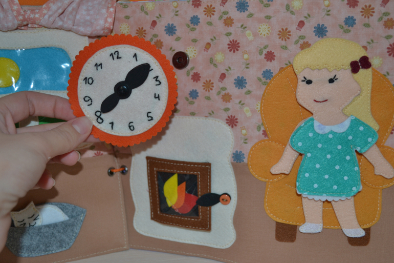 Гостинная. Вид за окном меняется на день и ночь. Часики на магнитной кнопке, стрелки движутся. Огонь в камине на магнитной кнопке, его можно "разжечь", а можно и затушить, спрятав в карман за магнитом.