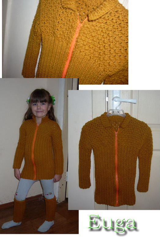 Вязание спицамиДочь подрастает и постепенно вещи становятся меньше. Вот я и решила обновить зимний гардероб. Связался комплект кофта на молнии и гетры сочного горчичного цвета: