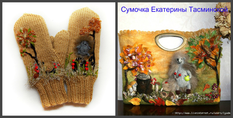 Вязание спицамиВдохновившись сумочками Екатерины Тасминской, сотворила новые рукавички))) С ежиком пришлось помучиться))) Но получился вроде бы вполне милый)))